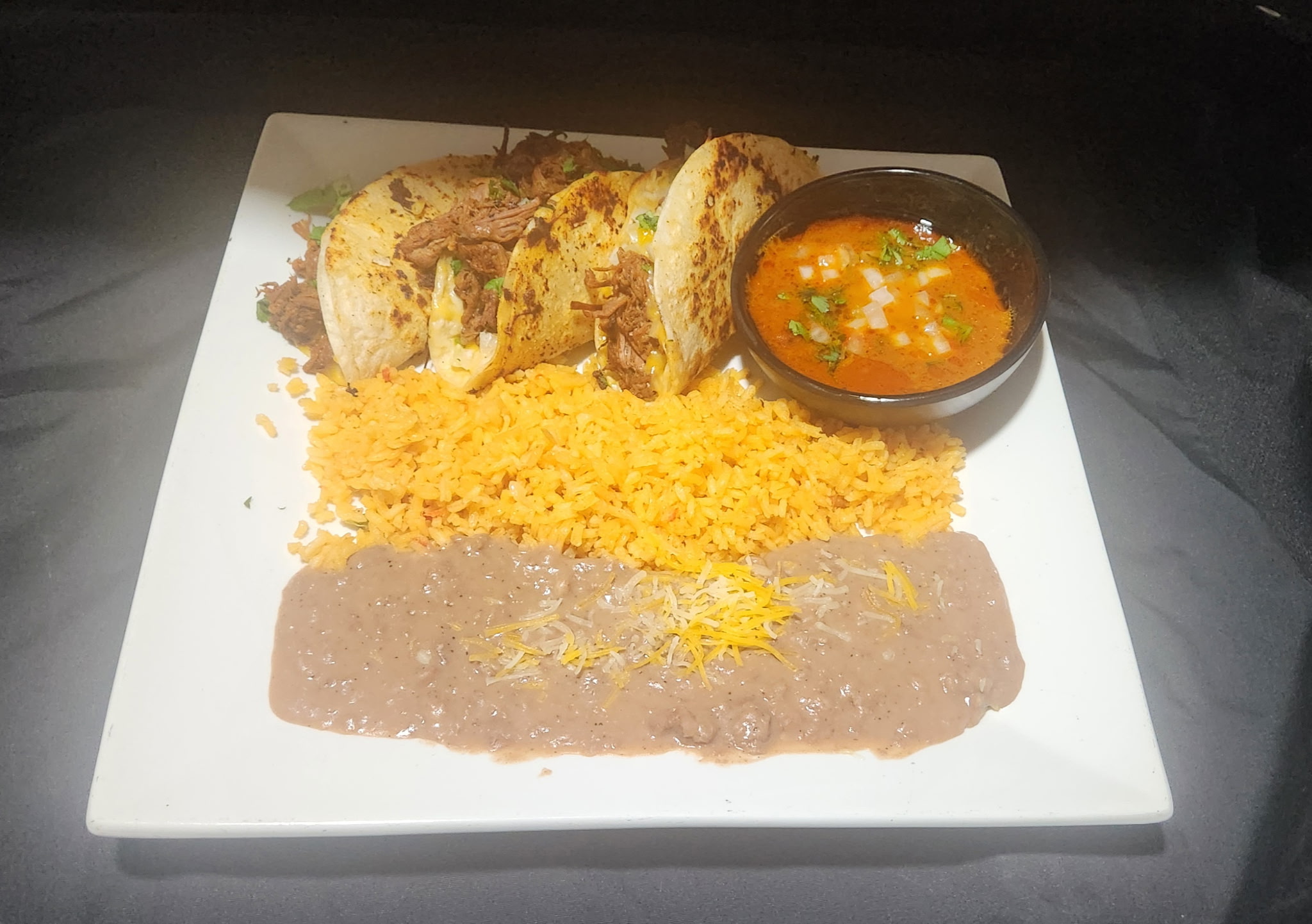 Special recipe shredded beef in pan-fried tortillas with cheese; served with birria broth and choice of rice and beans or charro beans.
